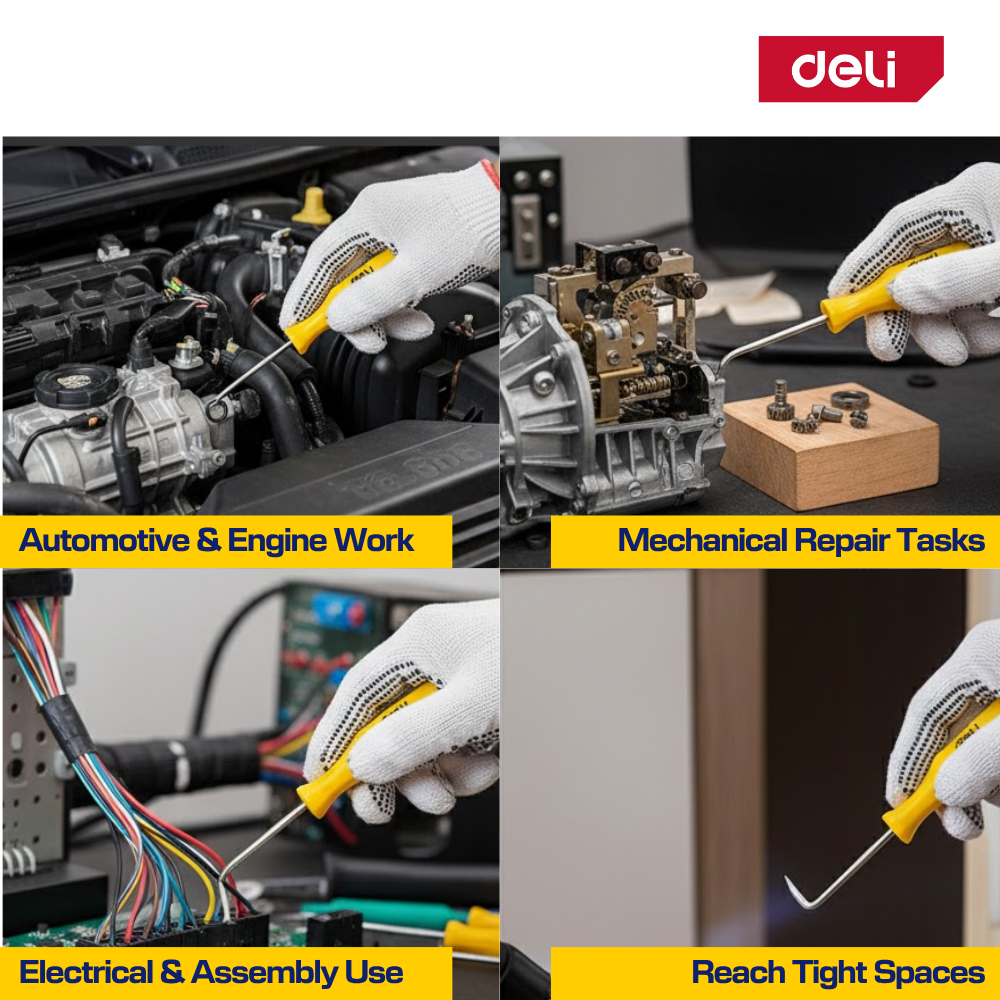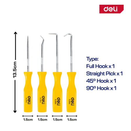 The Deli 4 Pcs Pick & Hook Set is a professional-grade toolkit designed for detailed mechanical, automotive, and electrical work. Made from S2 industrial steel with a chrome-plated finish, it provides strength and precision for reaching, removing, or adjusting small components even in tight spaces.