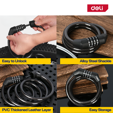 Deli Bicycle Lock 4 Digit Combination Cable Lock Waterproof for Bike & Scooter