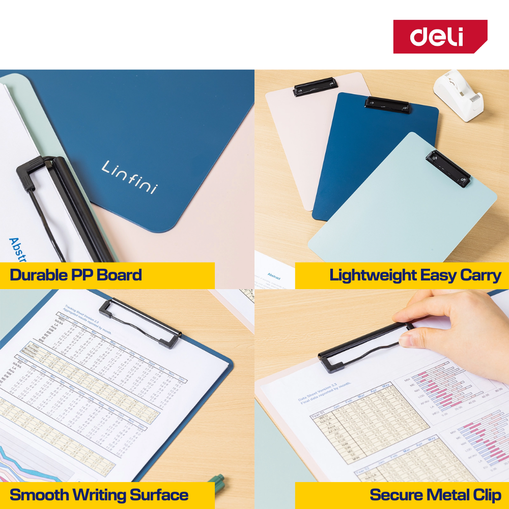 This Deli A4 clipboard is made from durable PP material with a smooth writing surface and a strong metal clip that holds documents securely.