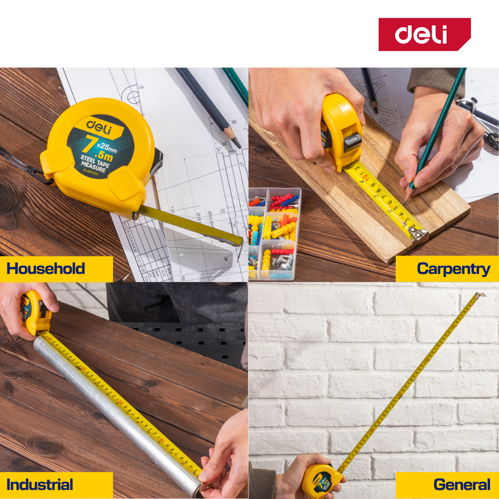 Built for professionals and DIY users, the Deli Measuring Tape ensures precise measurement every time. Designed with a durable steel blade and one-button auto lock for effortless use and long-lasting reliability.