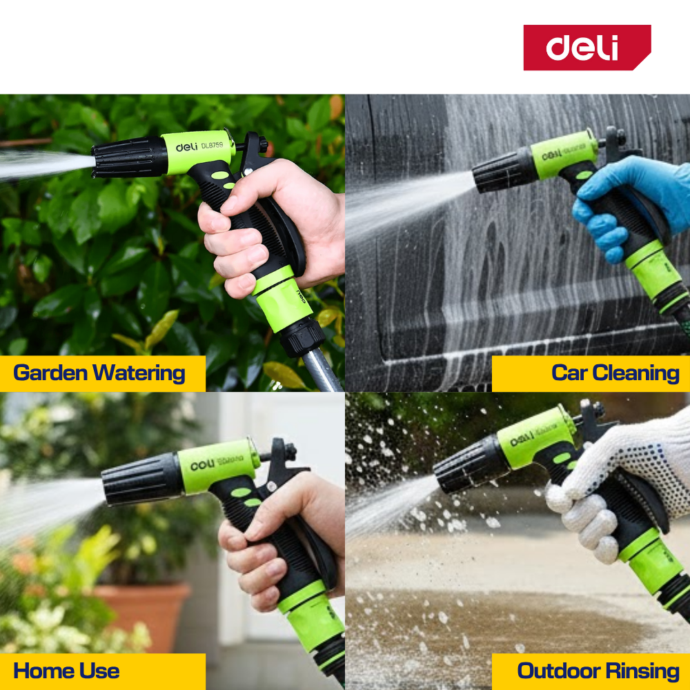 The Deli DL8759 Plastic Trigger Nozzle is designed for convenient outdoor watering and cleaning.