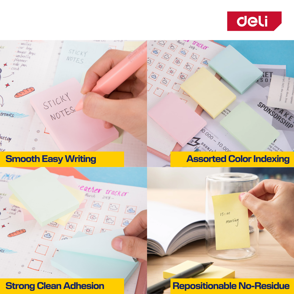 🌿 Deli Sticky Notes Assorted Colors (Good Adhesive, Repositionable, Easy Writing)