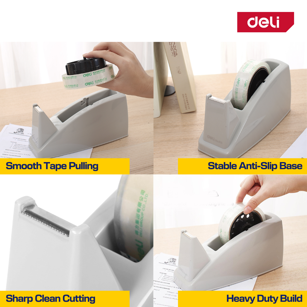 This Deli tape dispenser features a heavy-duty body with a dual-wheel design for smoother tape rotation.