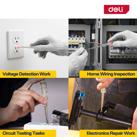 The DELI Test Pen is designed for detecting AC and DC voltages in electrical circuits. Ideal for electricians, technicians, and DIY users needing a quick and dependable voltage test.