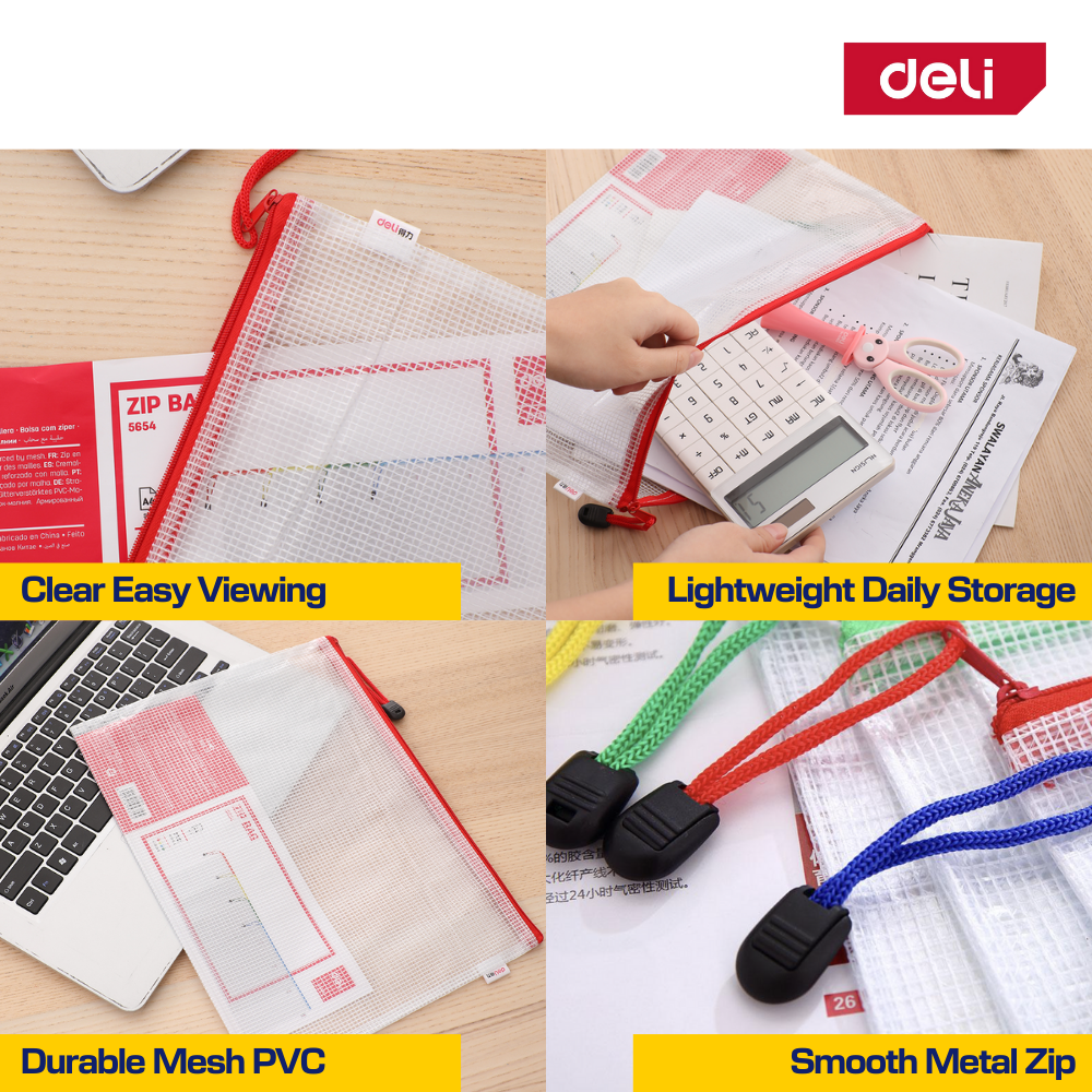 🌿 Deli Zip Bag A4 (Mesh PVC, Assorted Colors, Metal Zip)