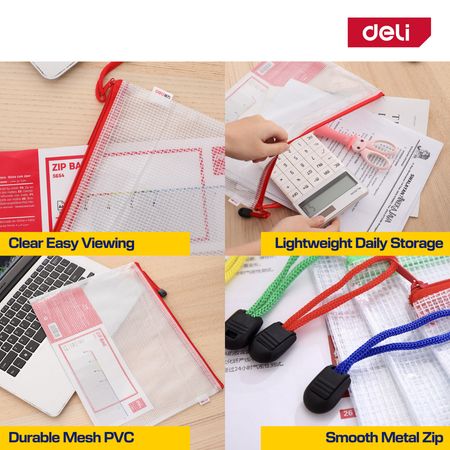 This Deli A4 zip bag is made from reinforced mesh PVC material for long-lasting use.