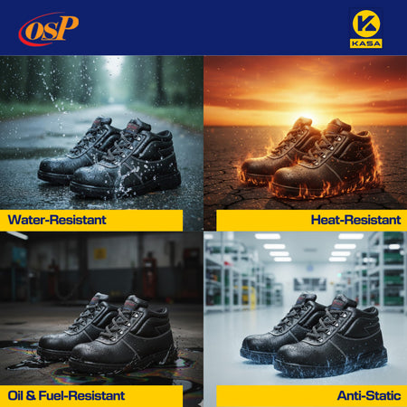 Designed for industrial, workshop, and construction environments, the OSP PU Base High-Cut Safety Shoes offer reliable protection with a steel toe cap, steel midsole, and high-cut ankle support.
